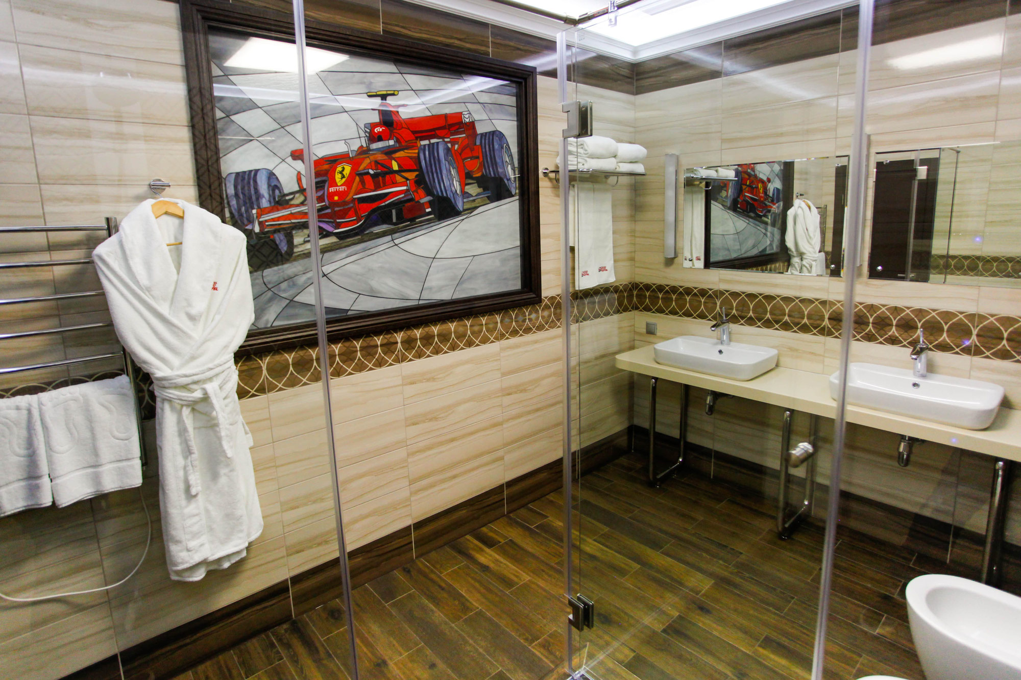 Отдельное внимание дизайнеры уделили деталям: во всех номерах представлены чайные наборы, удобные халаты и полотенца с символикой NRing. Также стоит отметить и роскошные картины в гоночной тематике с багетными рамами, которые приковывают взгляды постояльцев.