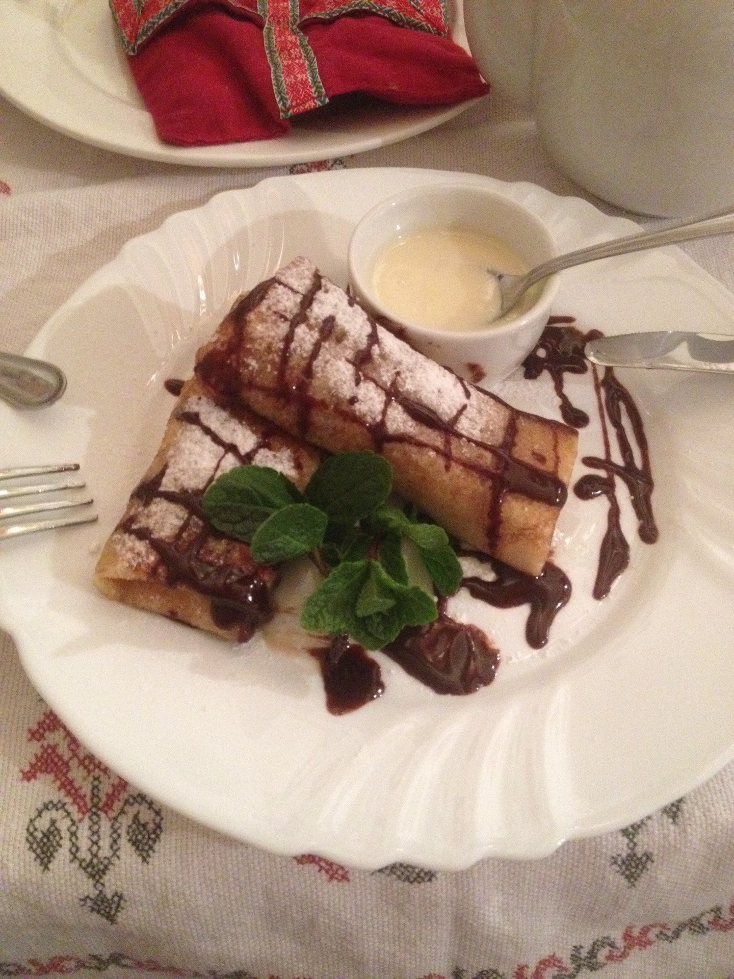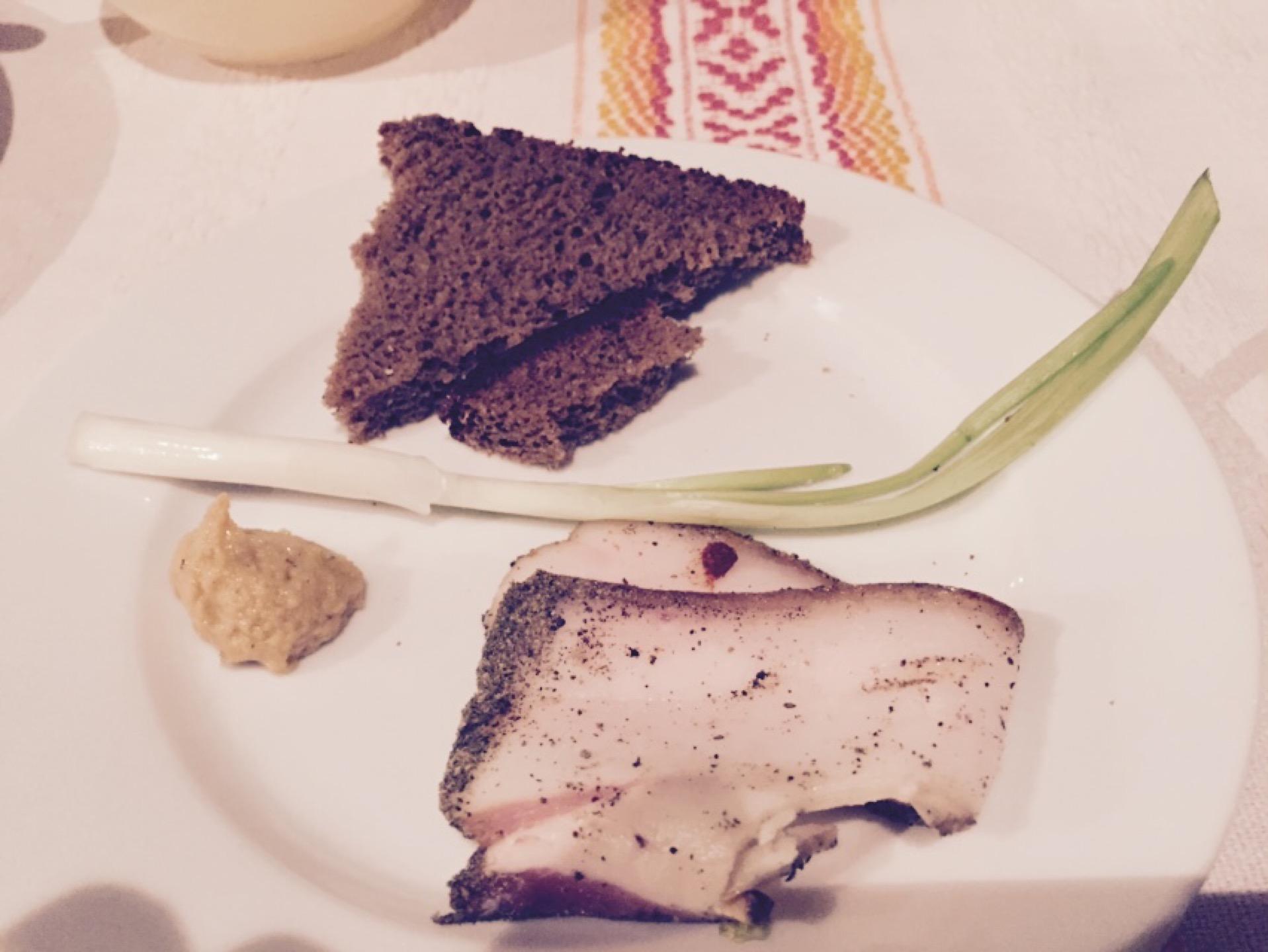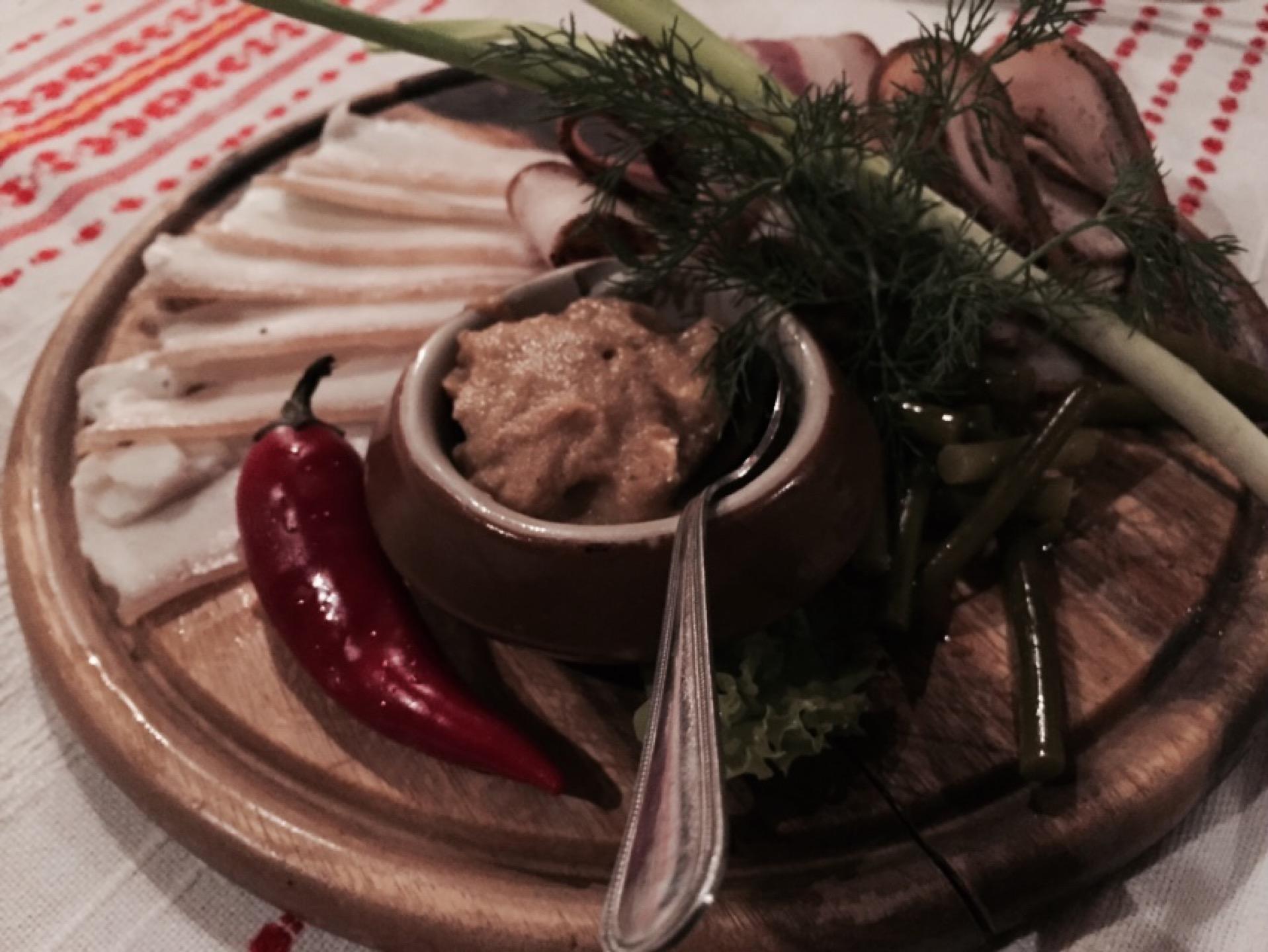 Аутентичный интерьер, меню с вышивкой и официанты говорят по-украински. На входе предлагают аперитив.